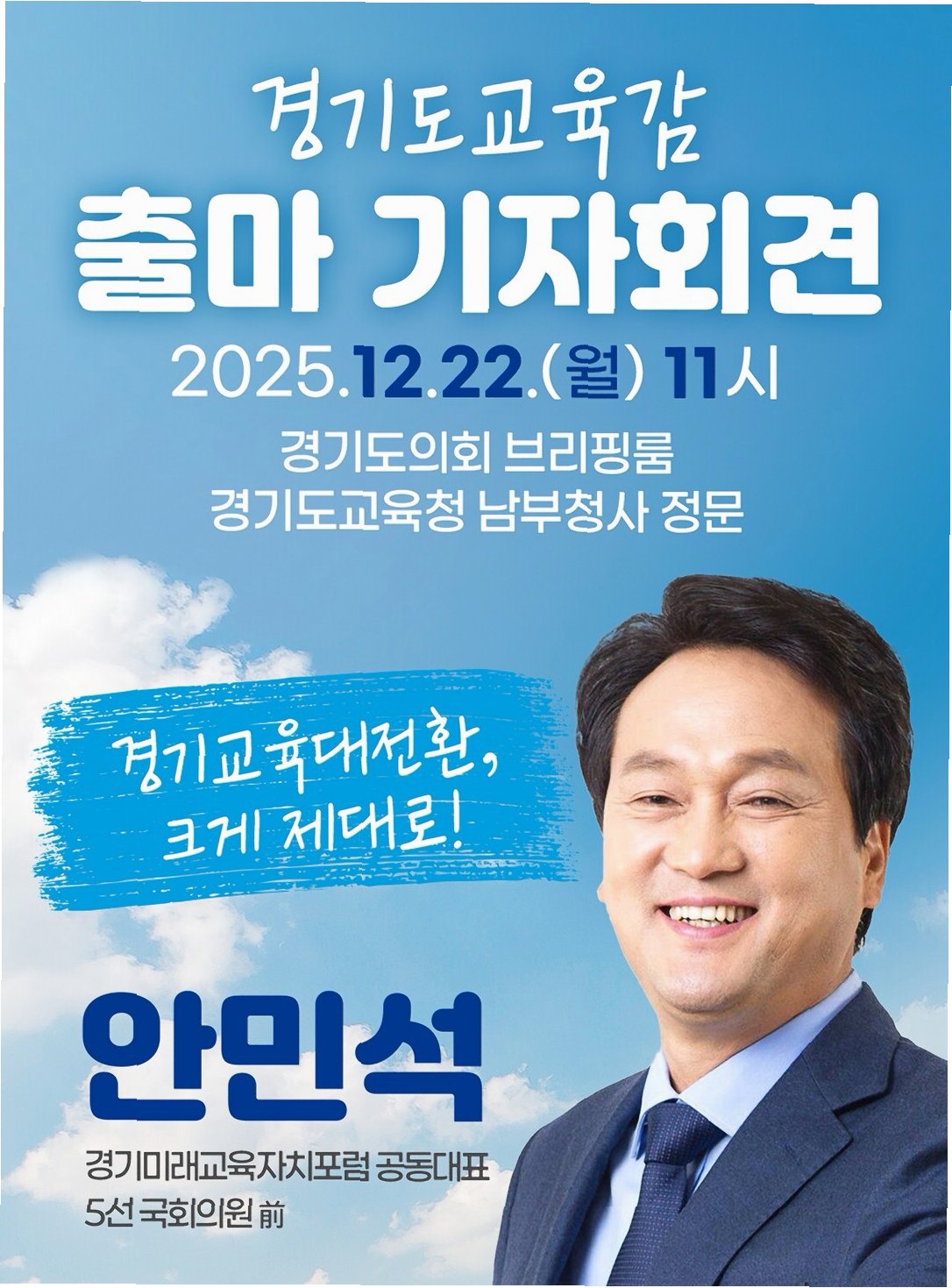 안민석 전 의원, 경기교육감 선거 출마 선언안민석 전 더불어민주당 의원이 내년 경기도교육감 선거 출마를 공식 선언하며 교육계에 새로운 바람을 예고했습니다. 22일, 경기도교육청 수원 광교청사 앞에서 열린 기자회견에서 안 전 의원은 굳은 의지를 드러냈습니다. 그는 '무상급식, 혁신교육, 학생인권'을 통해 대한민국 교육의 희망을 밝혔던 경기교육에 다시 빛을 밝히겠다는 포부를 밝혔습니다. 인공지능 시대를 맞이하여 암기식 교육에서 벗어나, 학생, 교사, 학부모 모두가 행복한 교육을 만들겠다는 비전을 제시했습니다. 교육 현장의 현실과 안 전 의원의 비전안 전 의원은 현재 교육 현장의 어려움을 날카롭게 지적했습니다. 학생들은 과도한 경쟁 속에서 고통받고, 교사들은 무너진 교권 앞에서 절망하며, 학부모들은 천정..
