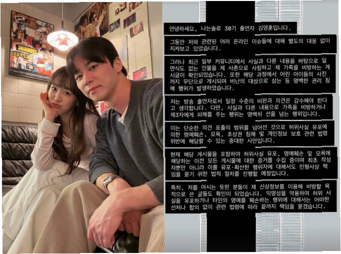 '나는 솔로' 30기 영수가 자신을 향한 악성 게시글에 대해 법적 대응을 예고했습니다. 그는 사실과 다른 내용으로 일면식도 없는 인물을 사촌으로 사칭하고 가족을 비방하는 게시글을 확인했다고 밝혔습니다. 어린 아이돌 사진까지 무단으로 게시하며 비난의 대상으로 삼는 등 명백한 권리 침해가 발생했다고 강조했습니다.