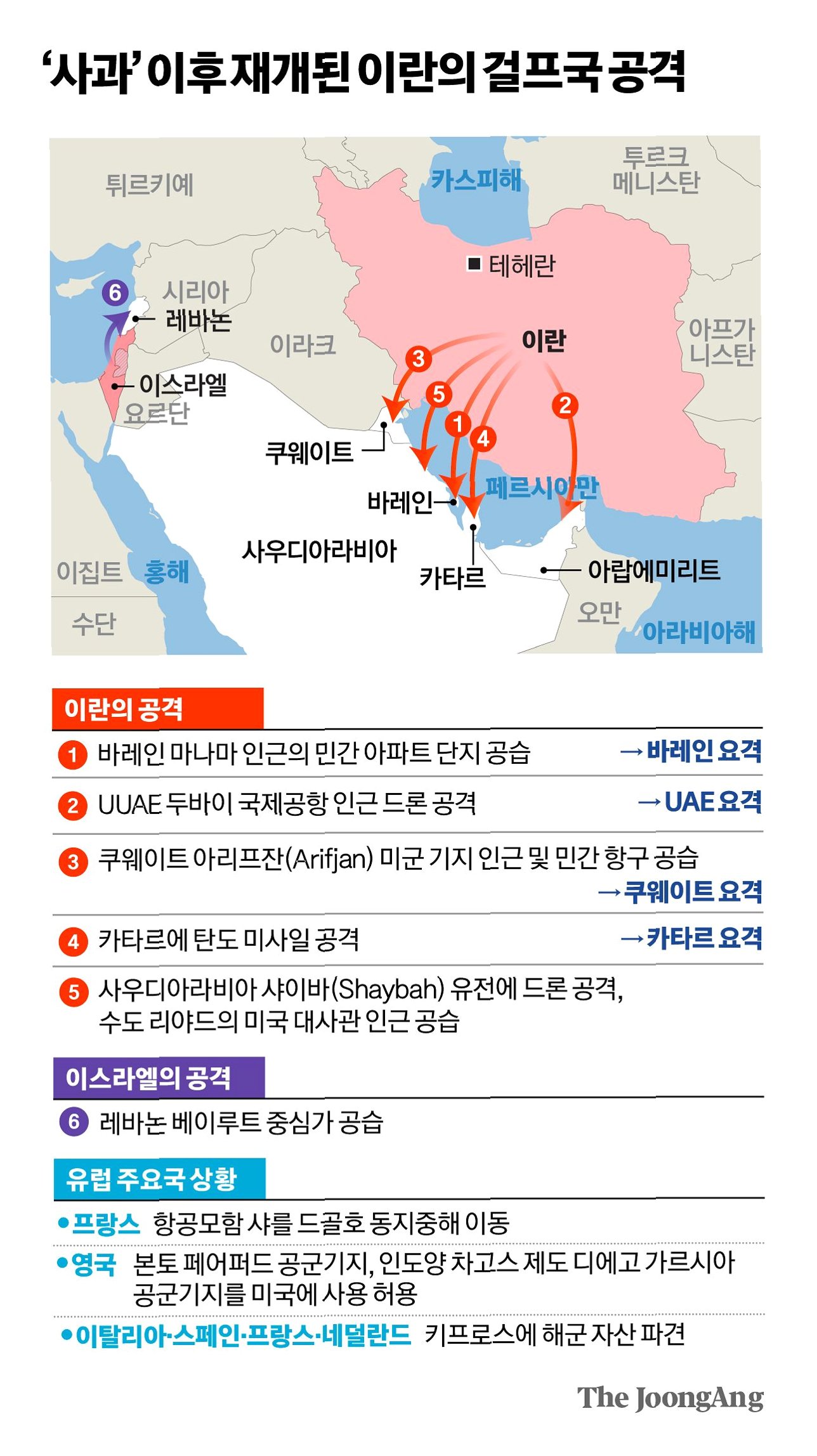 특히 이란은 미군 기지를 수용한 국가들에 직접적인 피해를 입힘으로써, 해당 국가들이 미국에 전쟁 중단을 요구하도록 유도하려는 목적도 가지고 있습니다. 이는 전쟁의 외연을 넓히고 외교적 압박을 가하려는 전략으로 분석됩니다.