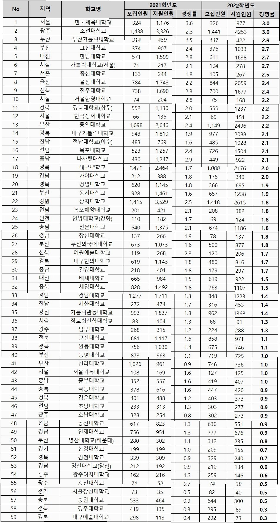 1.  경쟁률 격차: 서울 주요 대학 vs 지방 대학의 경쟁률 차이가 큽니다.
