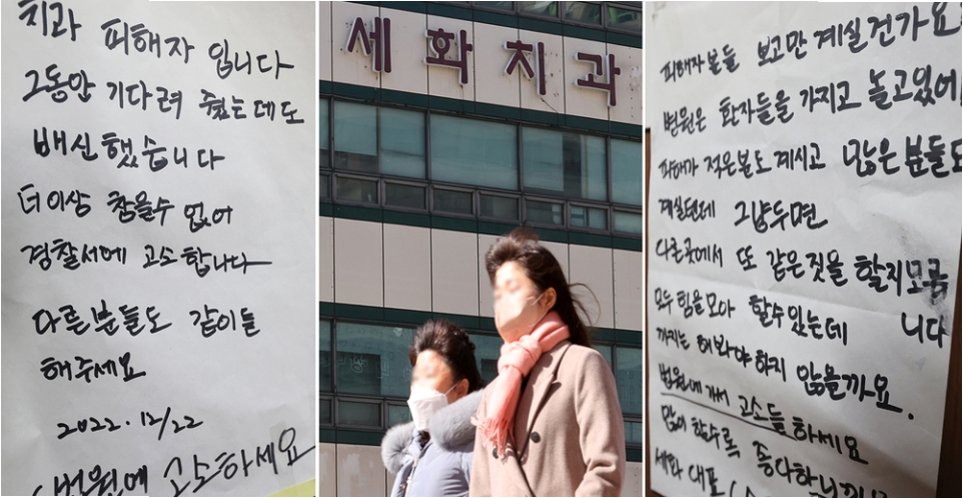 피해자들은 해당 치과가 '원장 개인 사정'을 이유로 최근 내원 환자들에게 진료 지연을 안내한 데 이어 지난 25일 갑작스럽게 '진료 중단' 안내문을 붙였다고 주장하고 있다.