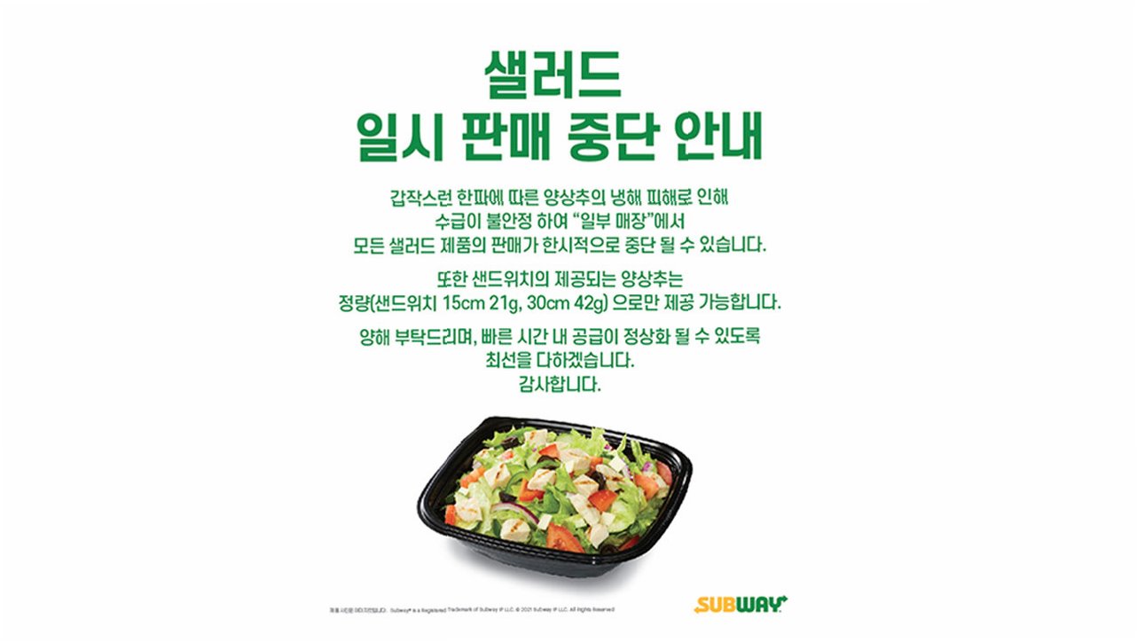 써브웨이 측은 “최근 이상 기온 영향으로 인해 모든 샐러드 제품 판매를 일시 중단키로 했다”며 “빠른 시간 내 공급이 정상화될 수 있도록 최선을 다하겠다”고 말했다.