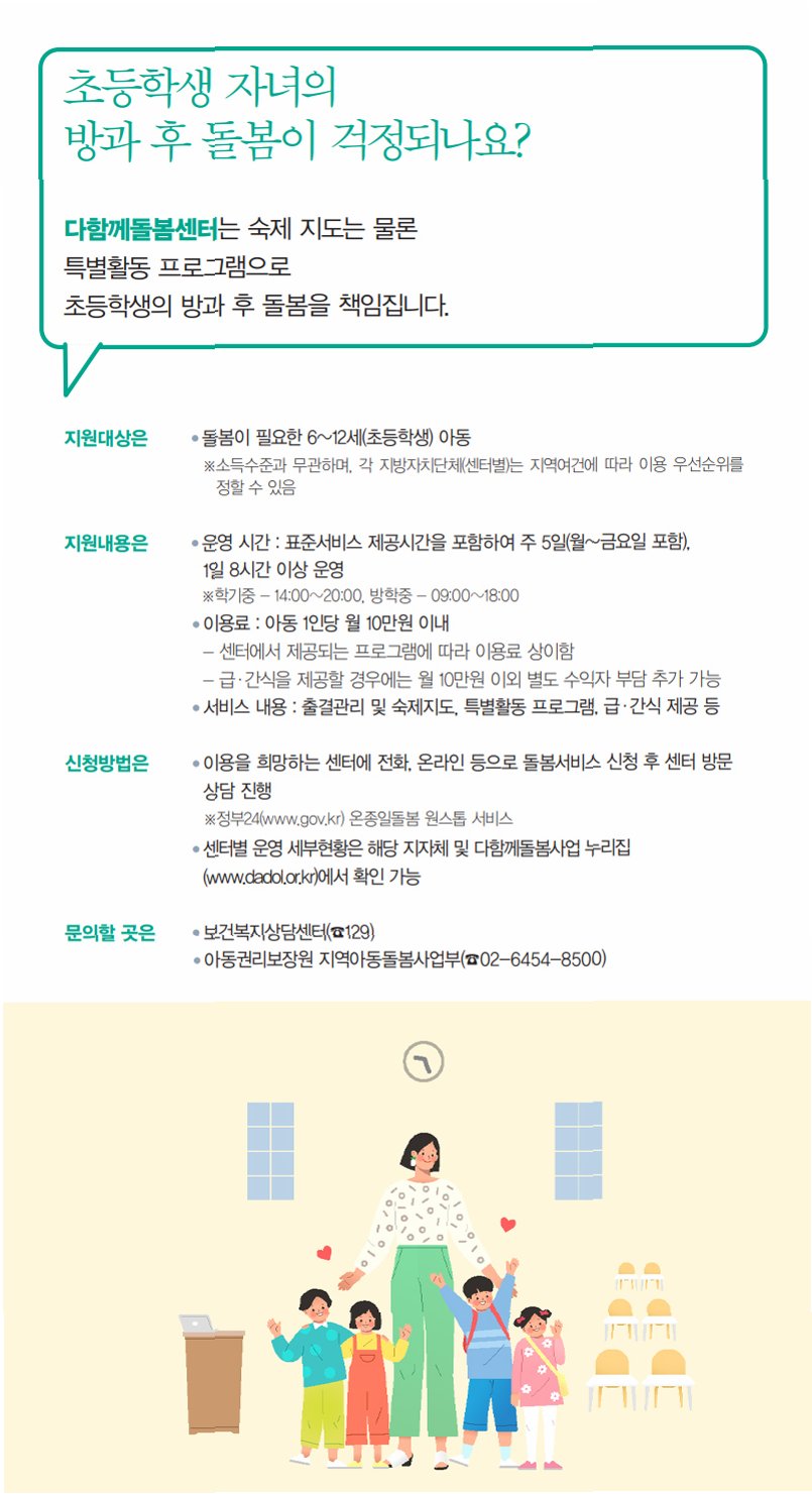 초등학생 시기는 아이들의 성장과 발달에 매우 중요한 시기예요. 돌봄 서비스는 아이들이 안전하고 즐겁게 시간을 보내면서, 건강하게 성장할 수 있도록 돕는 중요한 역할을 해요. 우리 아이에게 맞는 돌봄 서비스를 선택하고, 아이의 행복한 성장을 응원해주세요! 아이가 웃는 모습은 부모님에게 가장 큰 행복이니까요.