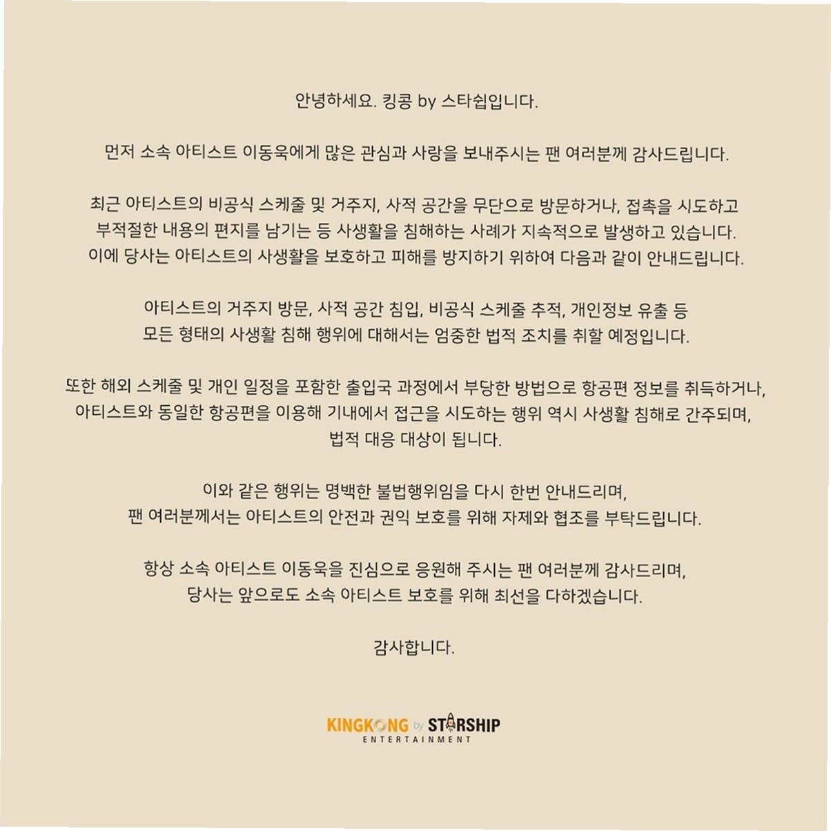 소속사는 아티스트의 안전과 권익 보호를 위해 팬들에게 자제와 협조를 당부했습니다. 팬들의 이러한 과도한 행동은 아티스트뿐만 아니라, 다른 팬들에게도 부정적인 영향을 미칠 수 있습니다. 킹콩 by 스타쉽은 아티스트의 사생활 보호를 위해 적극적으로 노력할 것이며, 팬들의 이해와 협조를 통해 긍정적인 팬 문화를 만들어나가기를 희망한다고 밝혔습니다.
