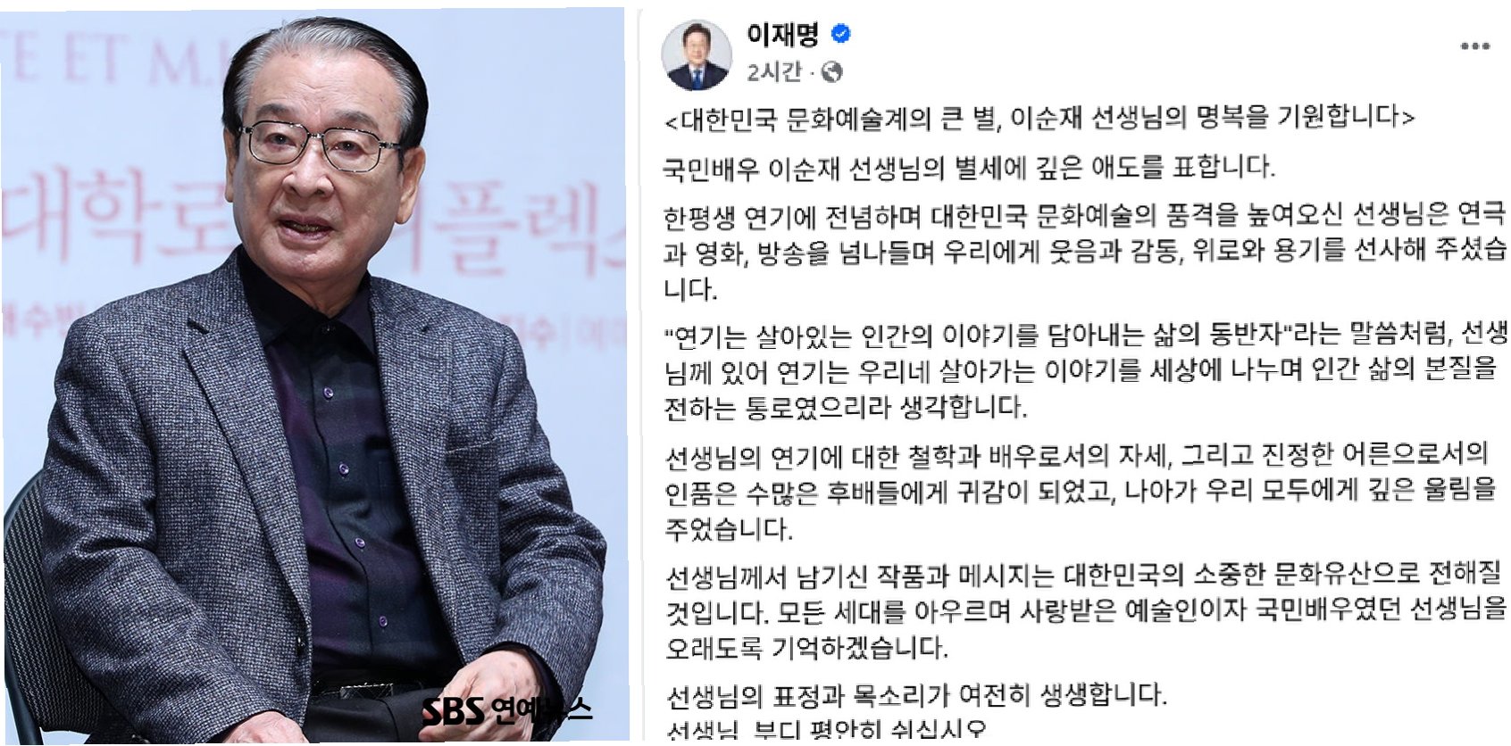 이재명 대통령은 고 이순재 배우를 '모든 세대를 아우르며 사랑받은 예술인이자 국민배우'라고 칭하며, '오래도록 기억하겠다'는 따뜻한 마음을 전했습니다대통령은 고인의 연기 열정과 인품을 기리며, 그가 남긴 작품과 메시지가 대한민국의 소중한 문화유산으로 길이 전해질 것이라고 강조했습니다.