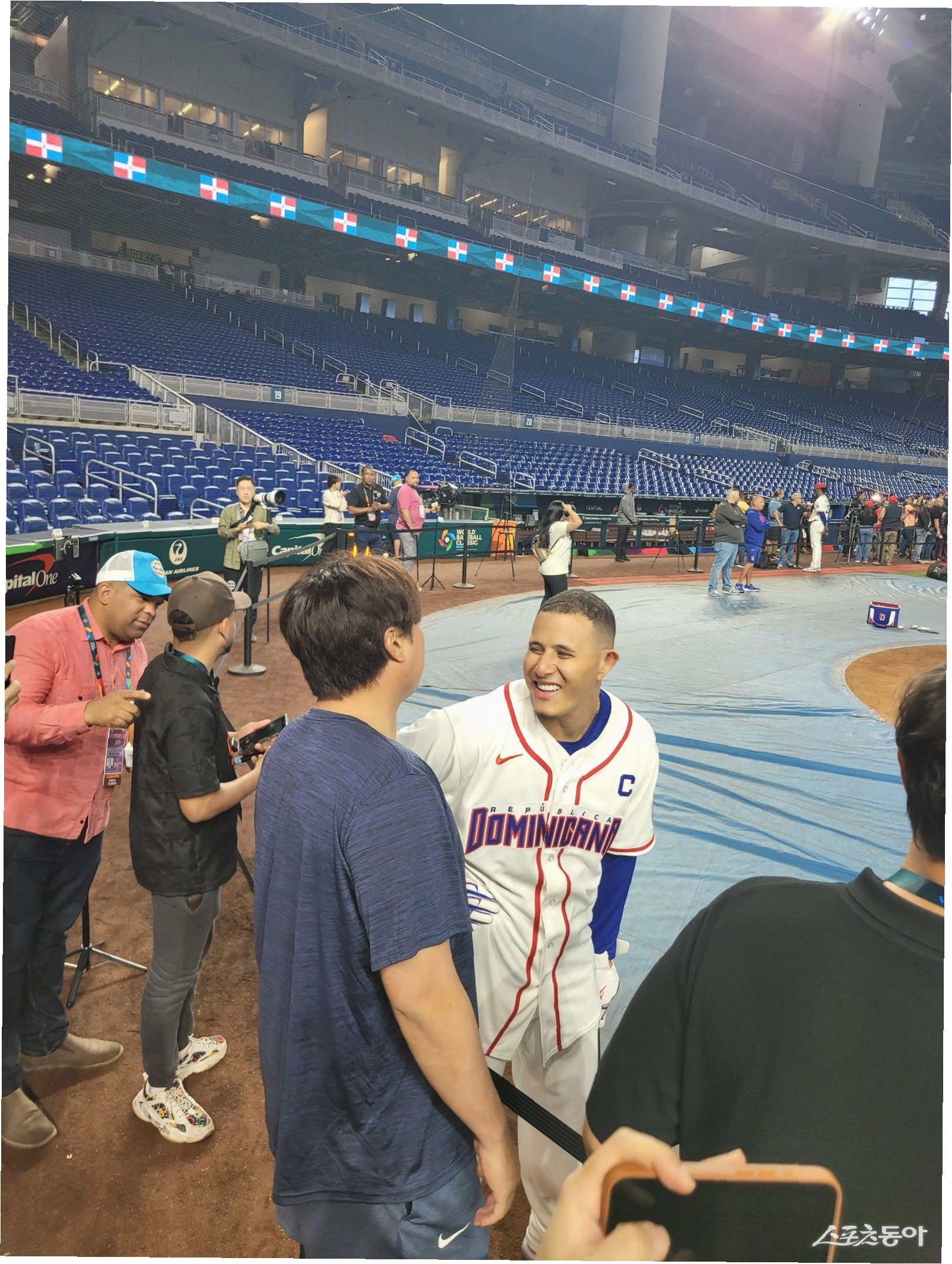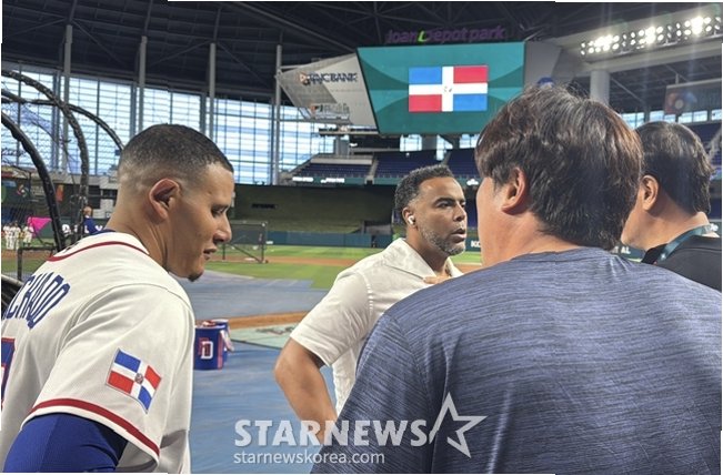 마차도의 반가움은 여기서 그치지 않았습니다. 도미니카공화국의 타격 훈련을 지켜보기 위해 그라운드에 나선 이정후 선수를 발견하고 또다시 반갑게 인사를 건넸습니다. 샌프란시스코 자이언츠에서 활약하는 이정후 선수는 마차도 선수와 같은 지구에서 뛰고 있어 평소에도 잘 알고 지내는 사이라고 밝혔습니다. 슈퍼스타들 간의 훈훈한 교류가 이어졌습니다.