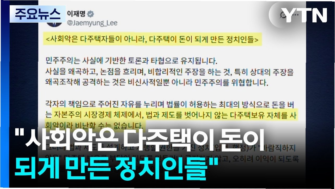 이재명 대통령은 바람직하지 않은 다주택 보유가 이익이 아닌 부담이 되도록 해야 할 정치인들이 오히려 특혜를 방치하고 다주택 투기를 부추기거나 초과 이익을 노리는 이해충돌까지 감행한다고 비판했습니다. 18일 자신의 엑스(X)에 '나쁜 제도를 활용한 다주택자들이 아니라 나쁜 제도를 만들어 시행한 정치인들이 비난받아야 한다'고 지적했습니다. 이는 장동혁 국민의힘 대표가 이 대통령을 향해 '다주택자를 사회악으로 규정한다'고 비난한 것에 대한 재반박입니다.