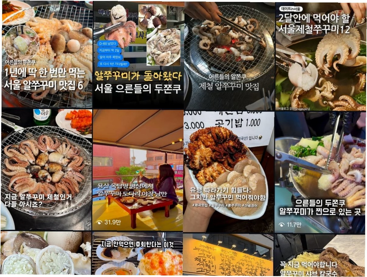 알주꾸미가 '쭈쫀쿠'라는 별명으로 SNS에서 화제가 되면서 관심도가 폭발적으로 증가했습니다. 밥알처럼 생긴 알이 주꾸미 머리를 감싼 모양이 최근 유행했던 '두바이쫀득쿠키(두쫀쿠)'와 비슷하다는 점에서 착안된 별명입니다. 썸트렌드에 따르면 '알쭈꾸미' 언급량이 전년 동기 대비 640% 이상 증가하는 등, '밴드웨건 효과'가 뚜렷하게 나타나고 있습니다. 이러한 SNS 바이럴과 제철 음식을 한정판처럼 여기는 2030의 소비 트렌드가 맞물려 '쭈쫀쿠' 열풍을 더욱 가속화하고 있습니다.