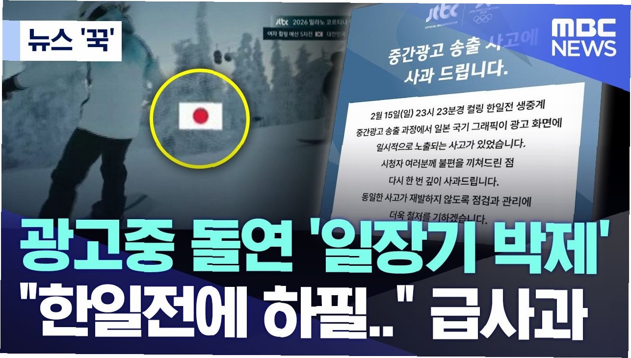 2026 밀라노·코르티나담페초 동계 올림픽 여자 컬링 한일전 경기 중, 광고 시간에 약 10초간 일본 국기인 일장기가 송출되는 초대형 방송 사고가 발생했습니다. 이는 스포츠 팬들의 공분을 샀으며, 중계 방송사인 JTBC는 공식 사과했습니다. 당시 경기는 스킵 김은지를 비롯한 여자 컬링 국가대표팀 경기도청(G5)이 일본을 상대로 7-5 승리를 거둔 중요한 5차전이었습니다.