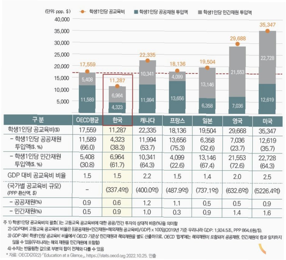 2. 입시 위주의 교육: 대학 입시를 위한 경쟁이 치열하며, 사교육 의존도가 높습니다.