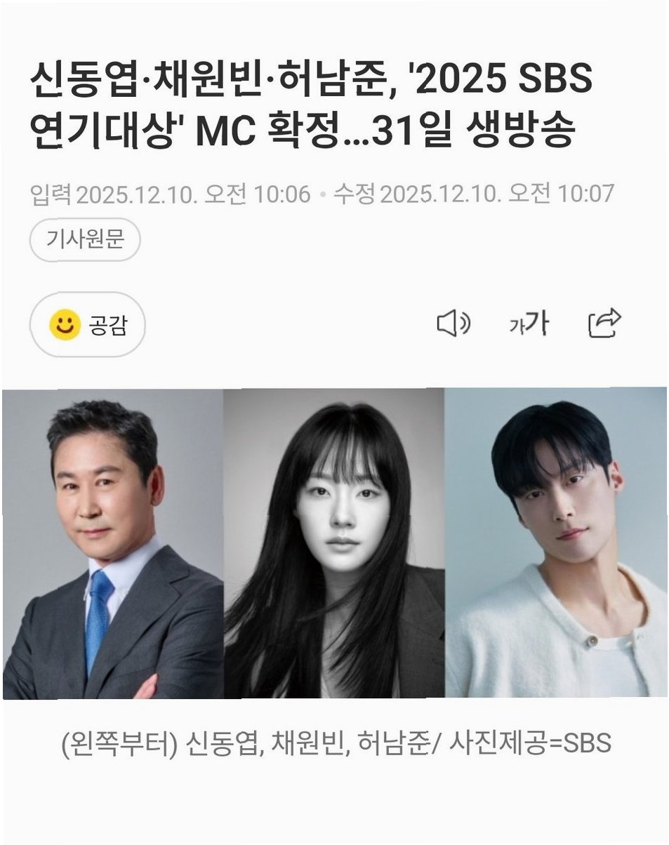 2025 SBS 연기대상, 신동엽·채원빈·허남준 MC 조합으로 역대급 시상식 예고!