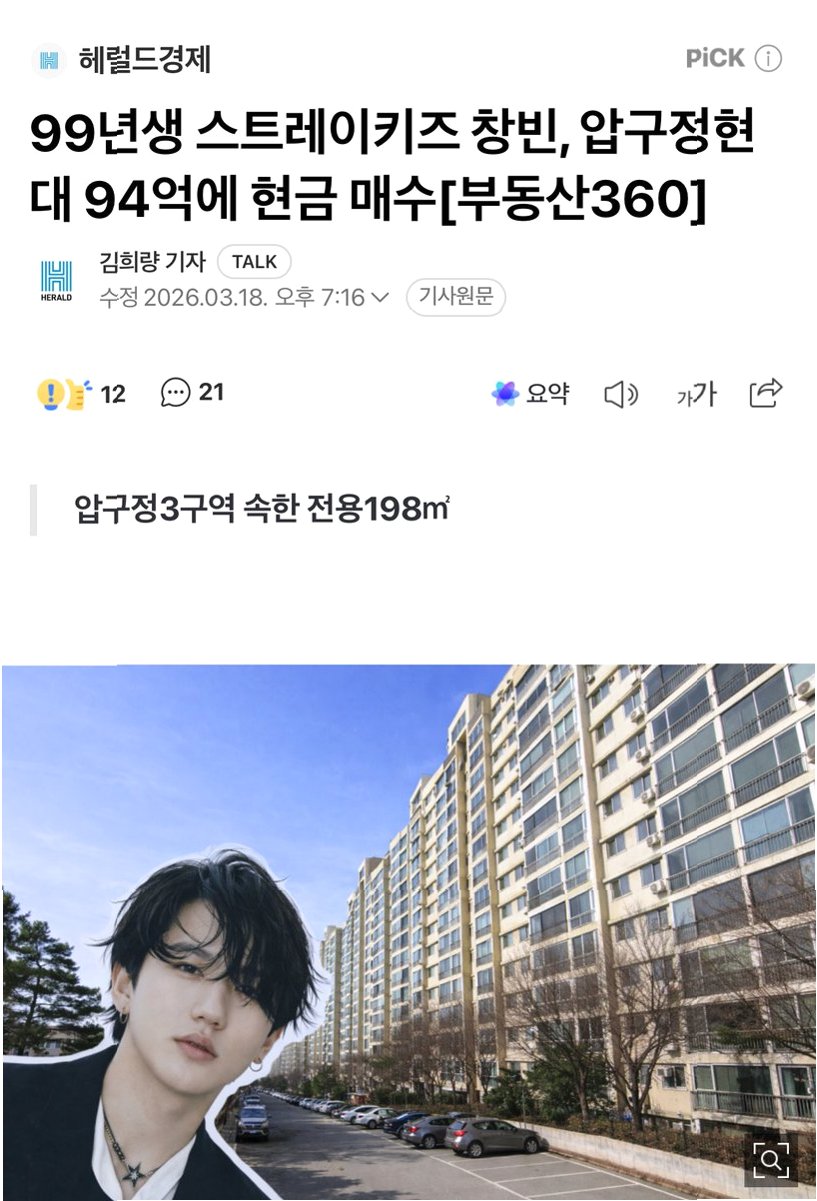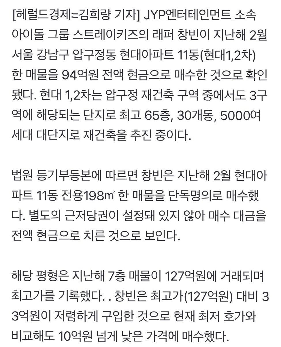 JYP엔터테인먼트 소속 아이돌 그룹 스트레이키즈의 래퍼 창빈이 지난해 서울 강남구 압구정동 현대아파트(현대1,2차)의 한 매물을 94억원 전액 현금으로 매수한 사실이 확인되었습니다. 이 아파트는 압구정 재건축 구역 중에서도 3구역에 해당하며, 최고 65층, 30개동, 5000여 세대의 대단지로 재건축이 추진 중입니다. 법원 등기부등본에 따르면 창빈은 별도의 근저당권 설정 없이 단독 명의로 매수 대금을 전액 현금으로 치렀습니다. 이는 미래 가치를 내다본 투자로 해석됩니다.