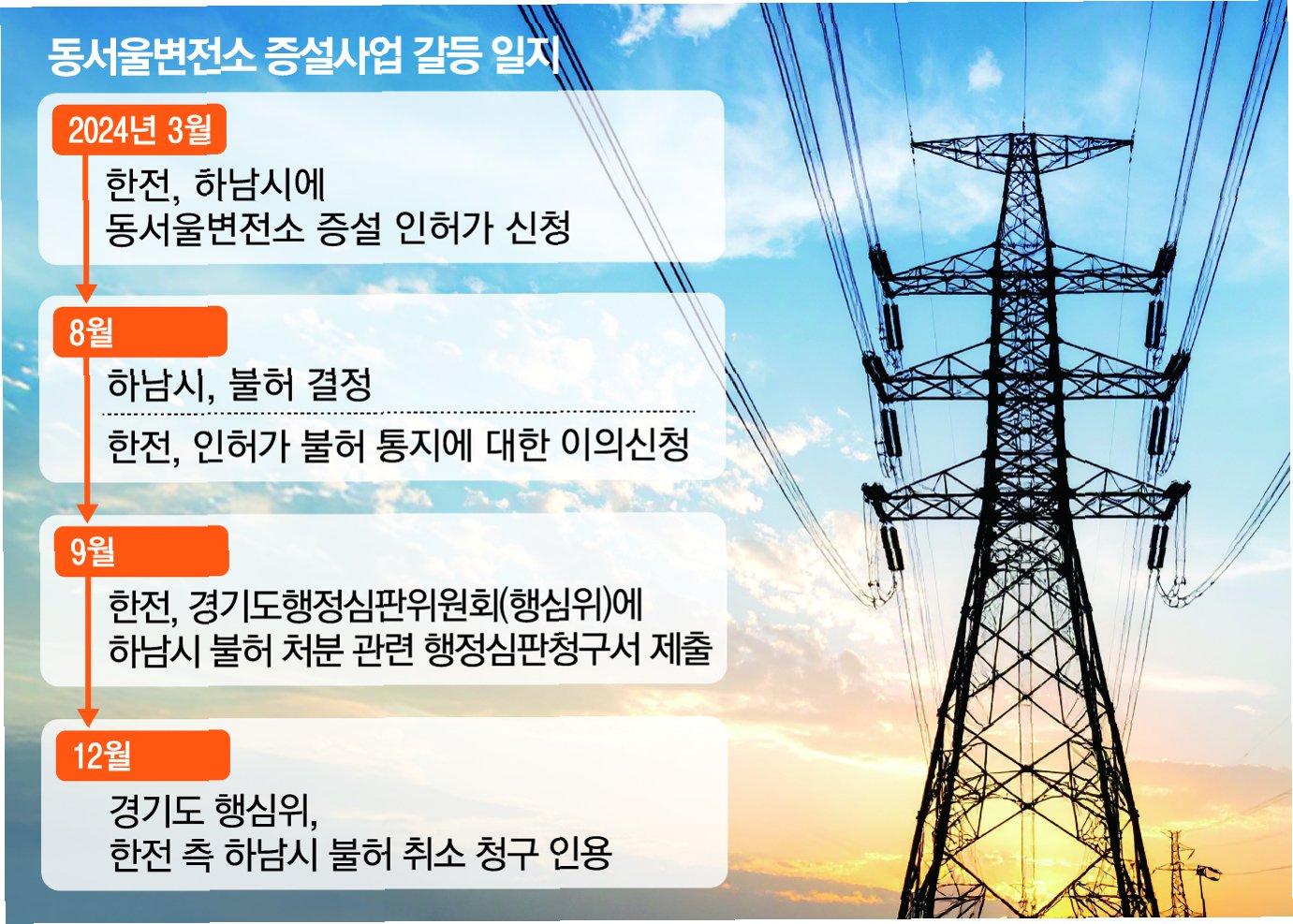 동서울변전소 증설은 하남시 지역 주민들의 강력한 반대에 직면해 있습니다. 하남시는 한전과의 MOU 체결 이후에도 주민 반발로 인해 건축 허가를 불허했고, 행정심판 패소 후에도 인허가를 미루며 시간을 끌어왔습니다. 전력망 특별법 시행으로 정부가 지자체 인허가를 대신할 수 있게 되었지만, 기후에너지환경부 장관의 재검토 시사로 인해 상황은 더욱 불투명해졌습니다. 이는 내년 지방선거를 앞두고 지역 주민들의 반발을 고려한 정치적 판단일 수 있다는 분석도 제기됩니다.