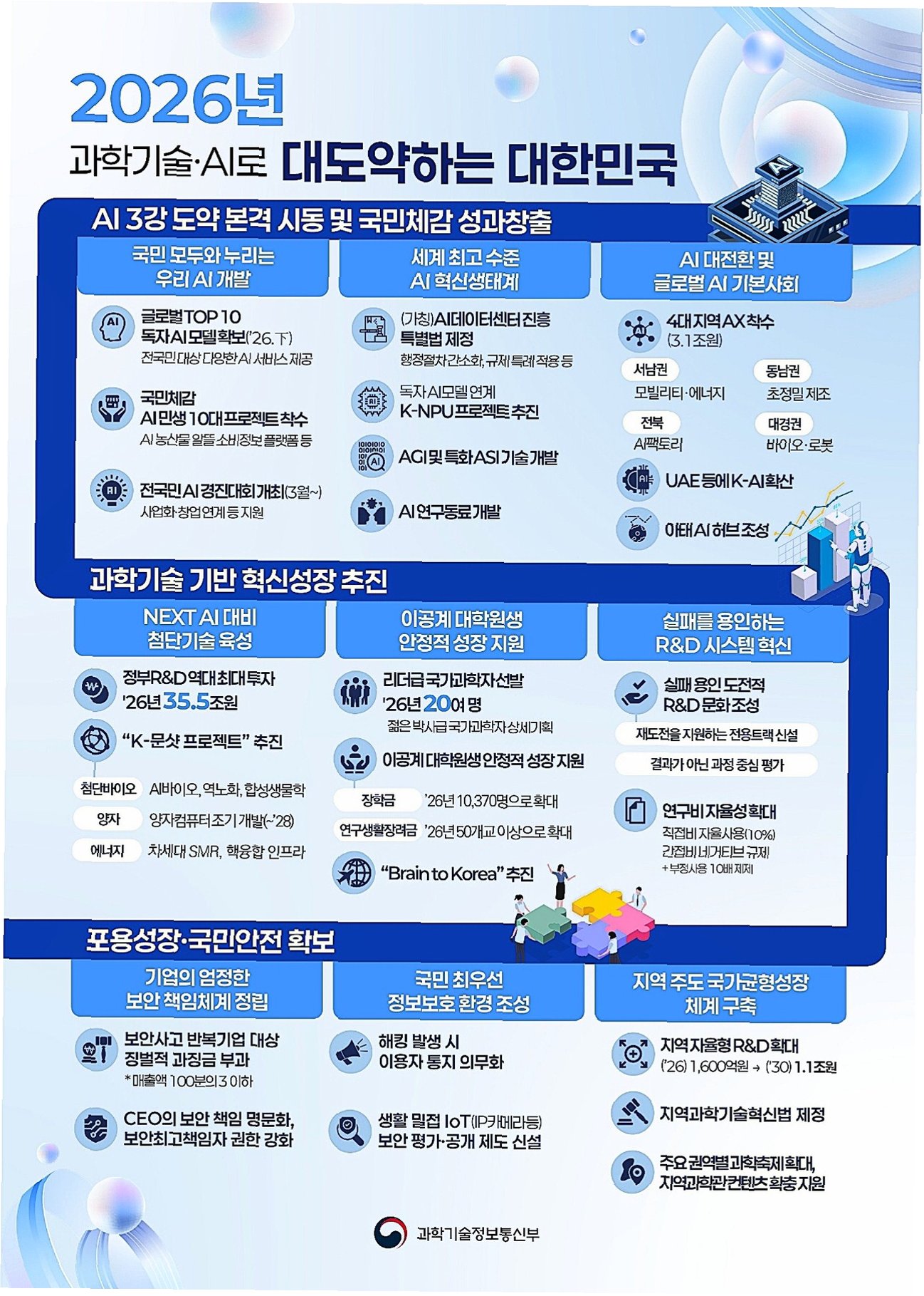 정부가 글로벌 인공지능(AI) 3대 강국 진입을 국가적 목표로 설정하고, 과학기술정보통신부(과기부)를 중심으로 정책 추진에 속도를 내고 있습니다. 신설된 인공지능정책실은 대한민국 AI 영토 확장의 핵심적인 역할을 수행하며, 김경만 인공지능정책실장은 '단순히 순위권에 드는 것을 넘어, 모든 기술 요소에서 평균 이상을 유지하는 '밀리지 않는 3위'가 되겠다'는 포부를 밝혔습니다. 이는 한국 AI 기술의 공고한 3위 안착을 목표로 하는 전략입니다.