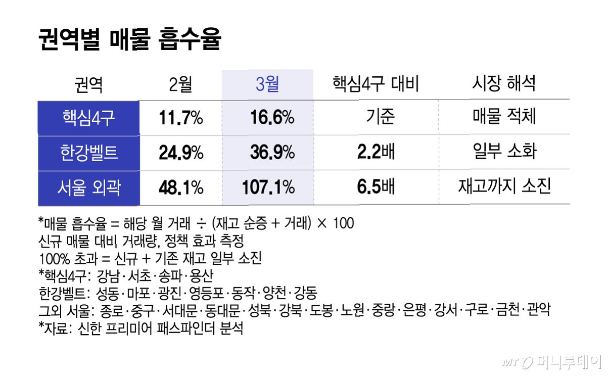 서울 강북권 아파트 매물이 눈에 띄게 빠르게 소진되고 있습니다. 신규 매물뿐만 아니라 기존에 나와 있던 매물까지 신속하게 거래되는 현상이 나타나고 있습니다. 이는 정부의 대출 및 세금 규제 강화로 강남권 아파트 매매가 주춤한 사이, 서울 외곽 지역으로 매수 수요가 집중된 결과로 분석됩니다. 신한 프리미어 패스파인더와 부동산 빅데이터 플랫폼 아실, 국토교통부 실거래가 분석에 따르면, 3월 기준 서울 외곽 14개구의 매물 흡수율은 107.1%를 기록했습니다. 매물 흡수율은 신규 매물 중 실제 거래된 비율을 나타내며, 100%를 넘는다는 것은 신규 매물보다 더 많은 거래가 이루어졌음을 의미합니다.
