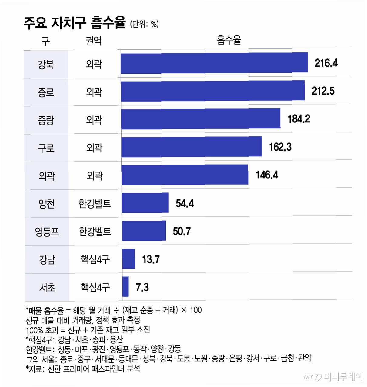 특히 강북구(216.4%)와 종로구(212.5%)는 매물 흡수율이 200%를 돌파하며, 신규 매물보다 2배 이상 많은 거래가 성사되는 놀라운 기록을 보였습니다. 중랑구(184.2%), 구로구(162.3%), 강서구(146.4%) 등도 100%를 훨씬 웃도는 높은 흡수율을 기록하며, 신규 매물뿐만 아니라 기존 재고 매물까지 활발하게 소진되고 있음을 보여줍니다. 이는 해당 지역의 아파트 매물이 얼마나 빠르게 시장에서 거래되고 있는지를 명확히 보여주는 지표입니다.