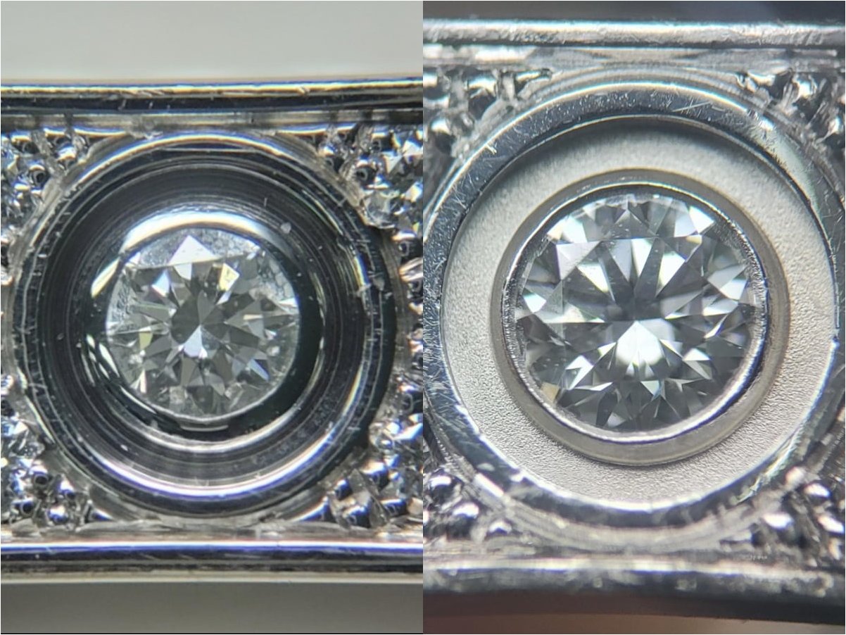 A씨가 공개한 사진은 정품과 비교했을 때 빛의 반사와 반짝거림이 크게 달랐다. A씨는 "정품은 제대로 된 폴리싱으로 인해 더 크고 반짝거림이 부각됐는데 불량품은 다이아몬드의 사이즈가 훨씬 작아 보이고 유리알처럼 칙칙하며 반짝임이 확연히 덜했다"고 설명했다.