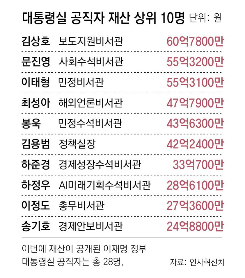 강남 3구에 주택을 소유한 9명의 고위 공직자 명단도 공개되었습니다. 강유정 대변인, 권혁기 의전비서관, 김상호 보도지원비서관, 김용범 정책실장, 봉욱 민정수석, 이성훈 국토교통비서관, 이정도 관리비서관, 이태형 민정비서관, 조성주 인사수석 등이 그들입니다. 이들의 부동산 재산 규모는, 일반 국민의 평균을 훨씬 뛰어넘는 수준으로, 사회적 형평성 논란을 야기할 수 있습니다.