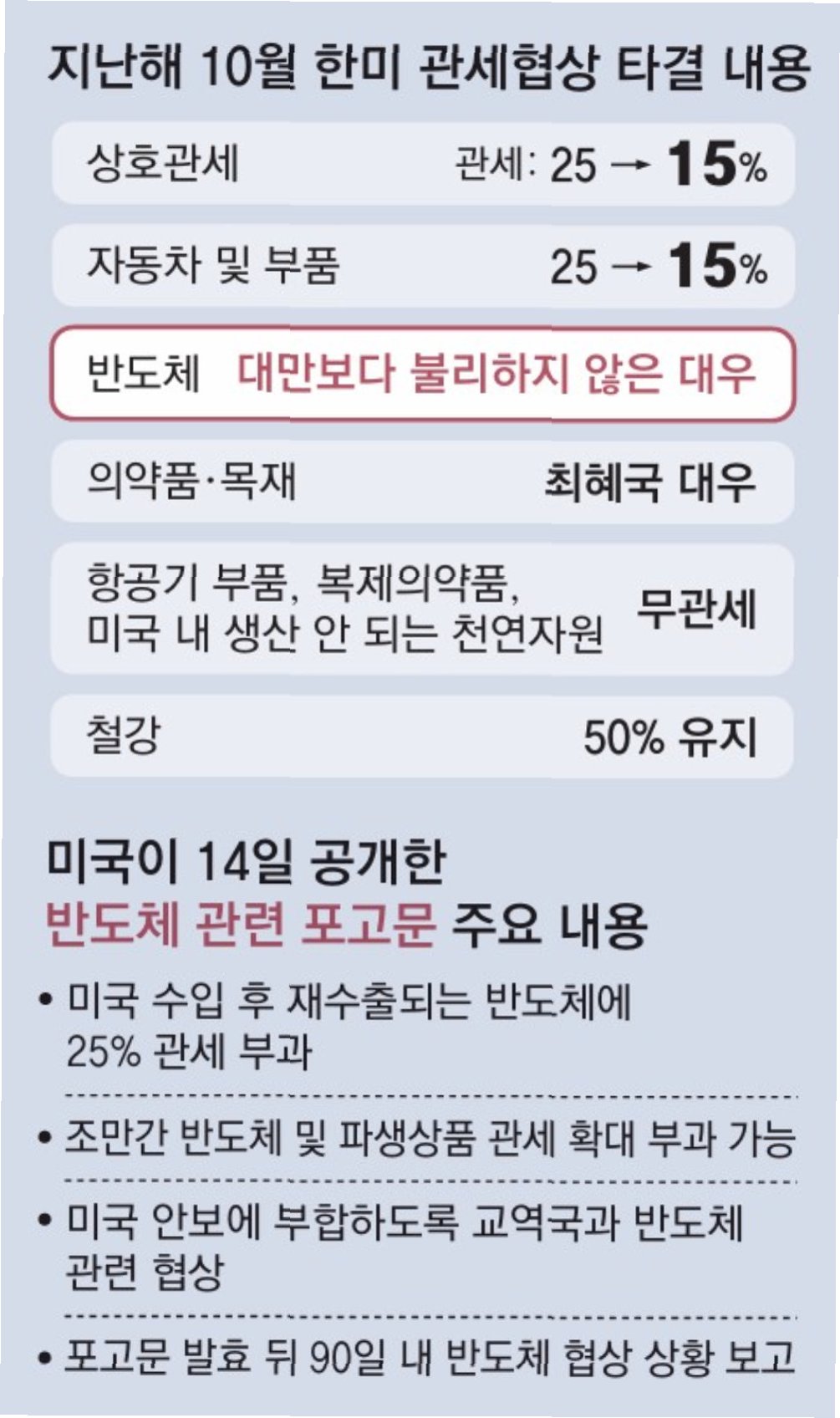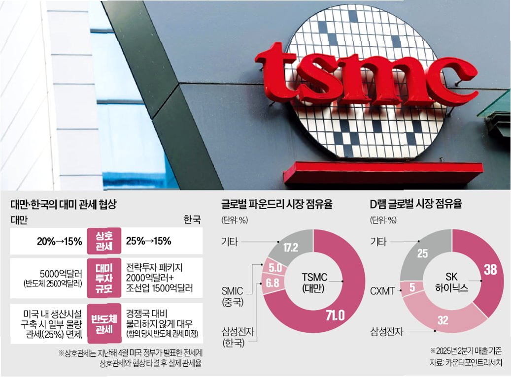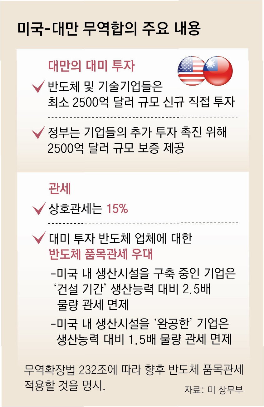 대만보다 먼저 미국과 무역 협상을 타결한 한국의 경우, 지난해 11월 발표된 한미 정상회담 '조인트 팩트시트(공동 설명자료)'에서 한국산 반도체 대(對)미 관세와 관련해 향후 미국이 '한국보다 대미 반도체 교역량이 많은 국가'와 체결할 합의보다 불리한 대우를 하지 않는다는 내용이 명시됐다.