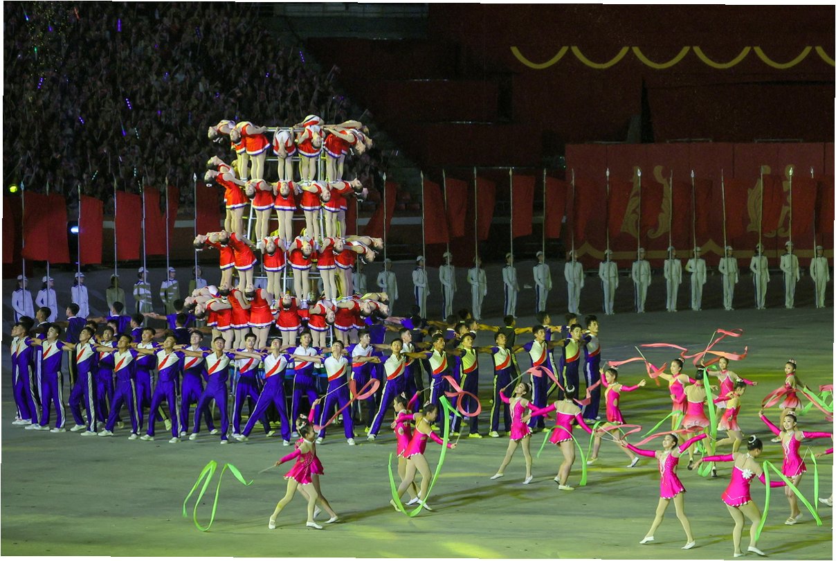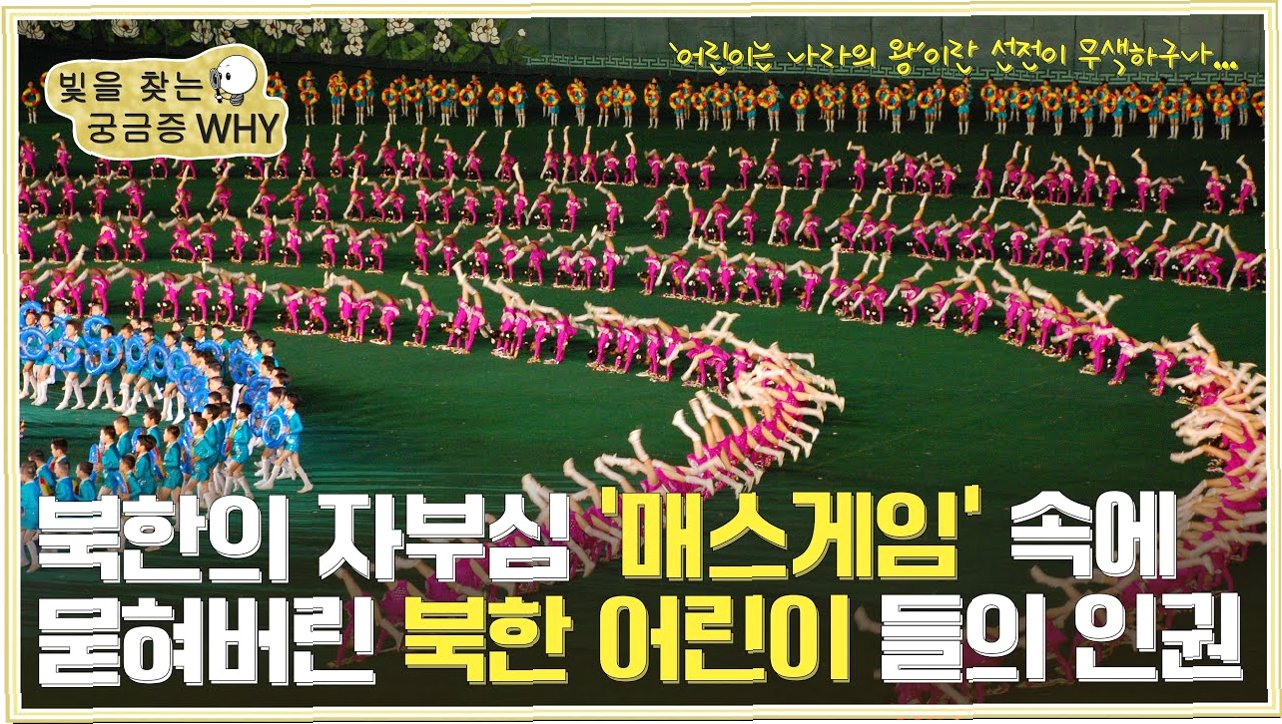 북한이 관광 상품으로 활용할 정도로 자부심을 갖는 대집단체조(매스게임) 공연도 전파를 탔습니다. 학생들은 리듬체조 경기에서 볼 법한 고난도 텀블링을 연달아 넘으며 꽃봉오리가 피는 듯한 장면을 연출했습니다. 무대는 아이들이 “아버지 원수님 고맙습니다”라고 외치며, 김정은을 향해 깡충깡충 뛰는 등 ‘김정은 찬양’으로 마무리되었습니다.