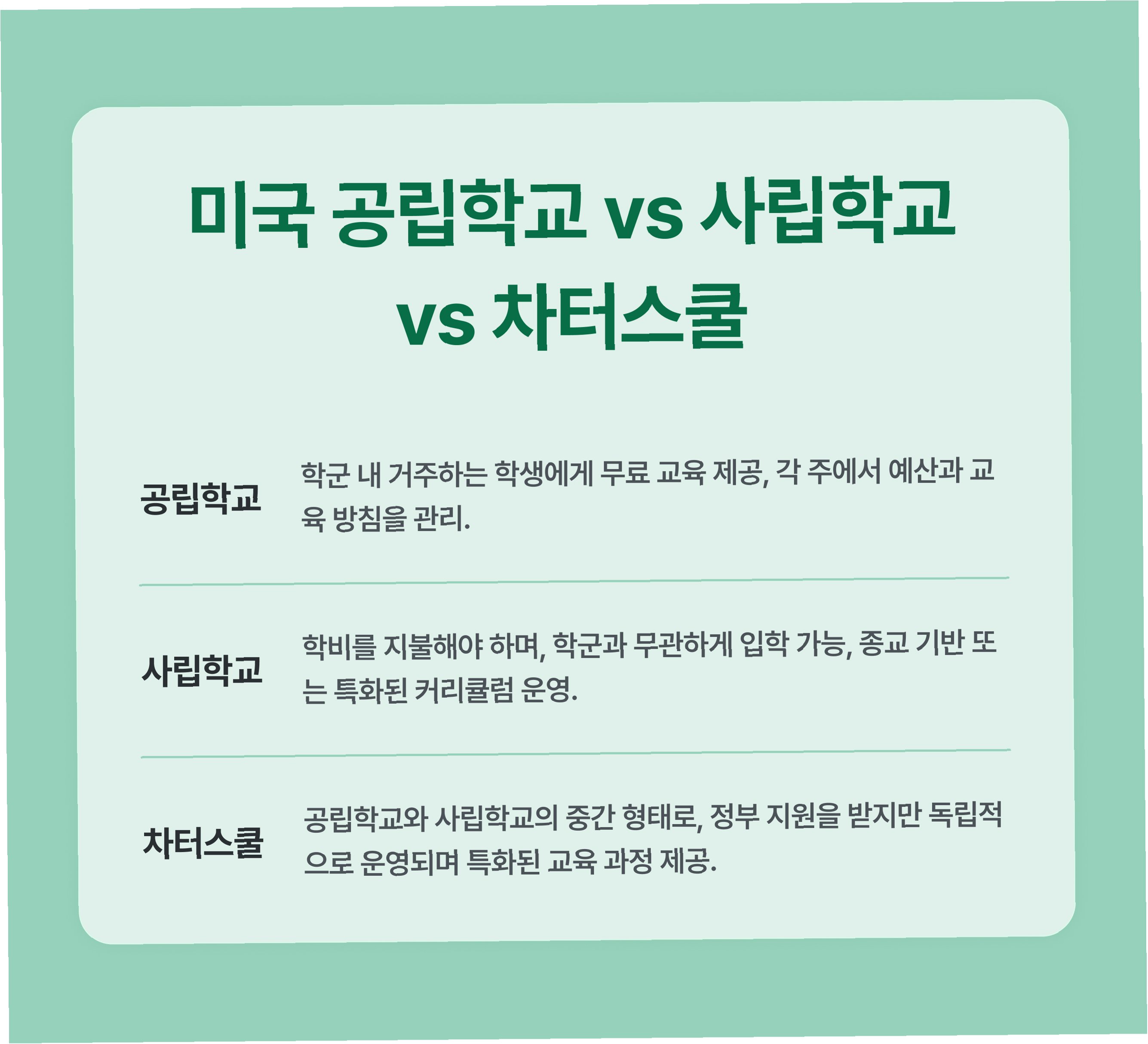 공립학교는 접근성과 포용성이 강점이며, 사립학교는 특성화된 교육과 환경을 제공합니다. 학교 선택은 아이의 개성과 가족의 가치관을 고려하여 신중하게 결정해야 합니다. 각 학교의 장단점을 비교 분석하고, 아이에게 가장 적합한 학교를 선택하여, 아이의 성장과 행복을 위한 최고의 선택을 하세요.