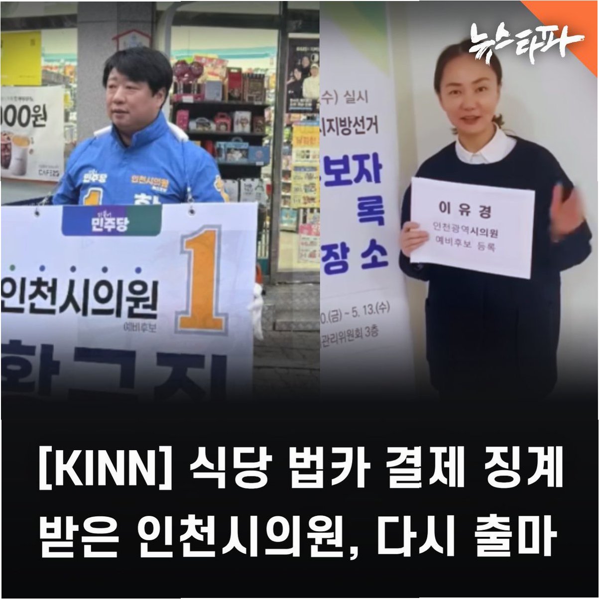 인천 남동구의원 출신 황규진, 이유경 의원이 가족 식당에 업무추진비를 사용한 징계에도 불구하고 인천시의원 출마를 강행하고 있습니다. 황 의원은 배우자 식당에, 이 의원은 부모님 식당에 각각 수천만 원의 세금이 사용된 사실이 드러났습니다. 이들의 출마에 대한 유권자들의 판단이 주목됩니다.