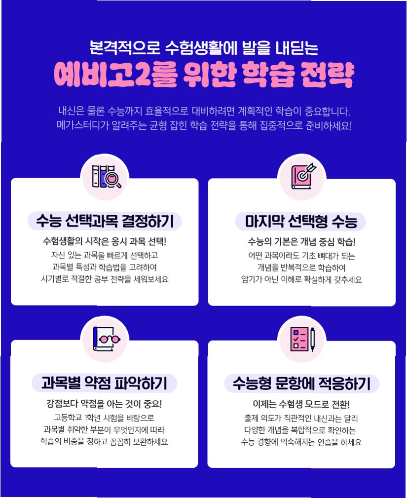 * 내신: 꼼꼼한 복습, 수행 평가 대비, 학교 활동 참여