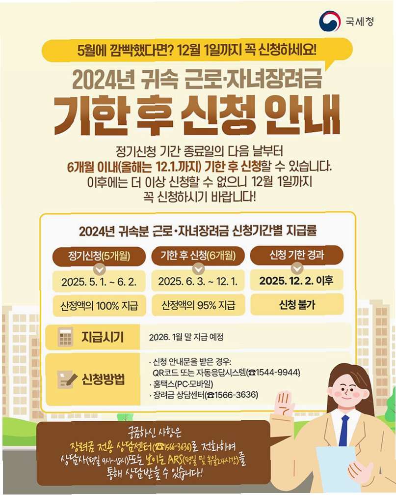 근로장려금은 소득이 낮은 근로·사업 가구의 생활 안정을 지원하는 중요한 제도입니다. 맞벌이 가구의 경우 최대 330만원까지 받을 수 있으며, 18세 미만 자녀가 있다면 추가 지원도 가능합니다. 신청 마감일은 이달 16일이며, 6월 25일에 지급될 예정입니다. 자동 신청 대상자도 꼼꼼히 확인하시고, 신청이 어려운 분들은 상담센터의 도움을 받으세요.