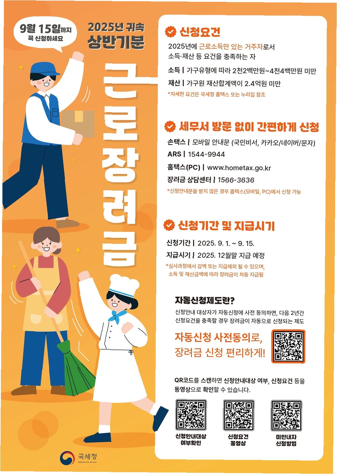 A.2025년 귀속 하반기분 근로장려금 신청 마감일은 이달 16일입니다.