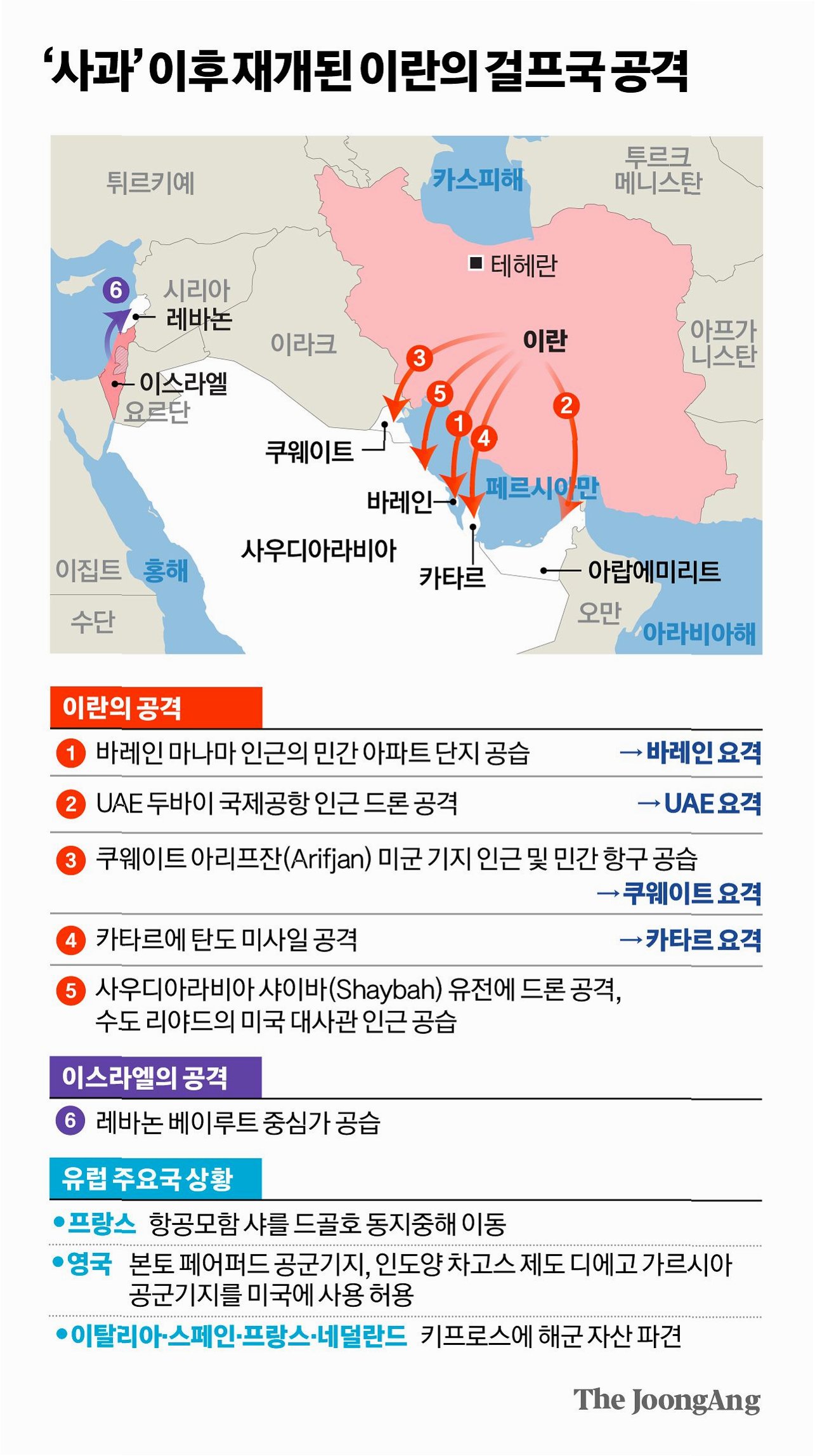 이번 사우디 미군 기지 공격은 이스라엘이 이란의 핵시설 2곳을 공격한 직후 발생했습니다. 이란 원자력기구는 아라크의 샤히드 혼다브 중수 복합시설과 야즈드 주의 아르다칸 옐로케이크 생산 시설이 공격받았다고 밝혔으나, 사상자나 방사능 오염 위험은 없다고 덧붙였습니다. 하지만 이슬람혁명수비대(IRGC)는 즉각적인 보복을 경고하며 긴장감을 고조시키고 있습니다.