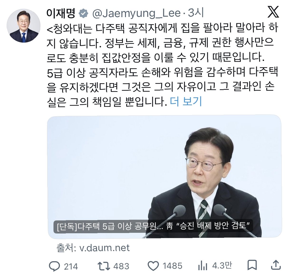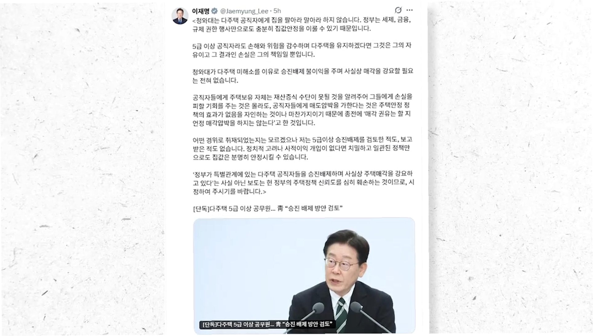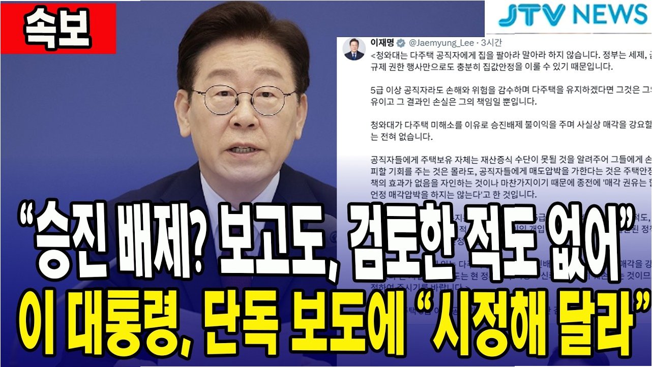 이재명 대통령은 다주택 보유 공직자의 승진 배제 보도를 부인하며, 개인의 재산 선택과 책임은 존중되어야 한다고 강조했다. 정부는 매각 강요 없이 정책 효과를 달성할 수 있으며, 잘못된 보도는 정책 신뢰도를 훼손하므로 시정이 필요하다는 입장이다.