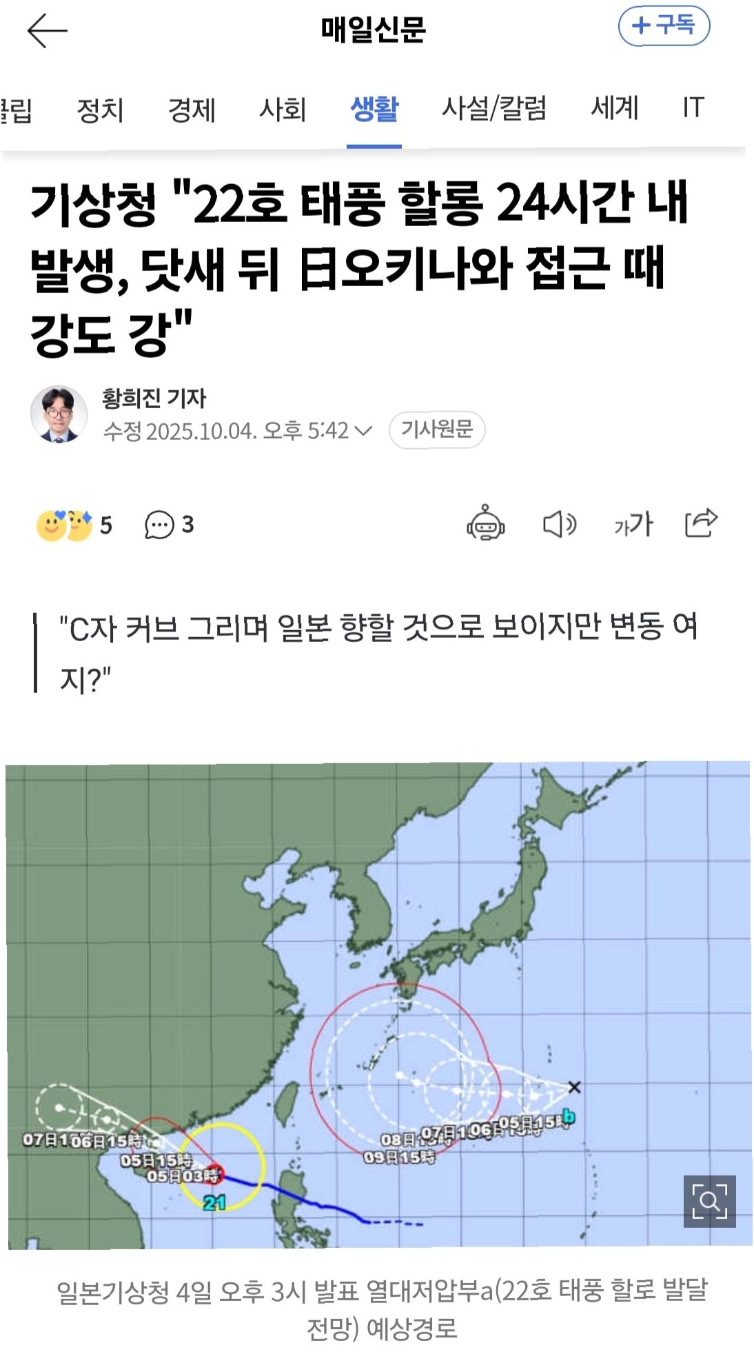 22호 태풍 할롱, 오키나와 C자 유턴? 한반도 향할까… 초미세 경로 예측