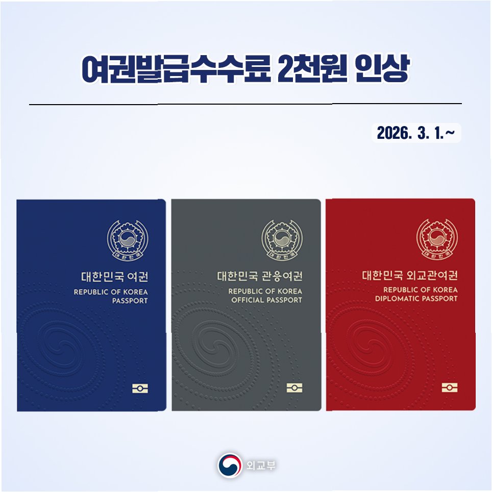 20년 만에 여권 발급 수수료가 2000원 오른다. 10년 복수여권 기준 5만 2000원으로 인상되며, 해외 재외공관 발급 수수료도 2달러 오른다. 제조 원가 상승이 주된 배경이며, 2월 말까지 신청 및 결제 시 인상 전 금액이 적용된다. 정부는 편의 기능 강화를 통해 접근성을 높일 예정이다.