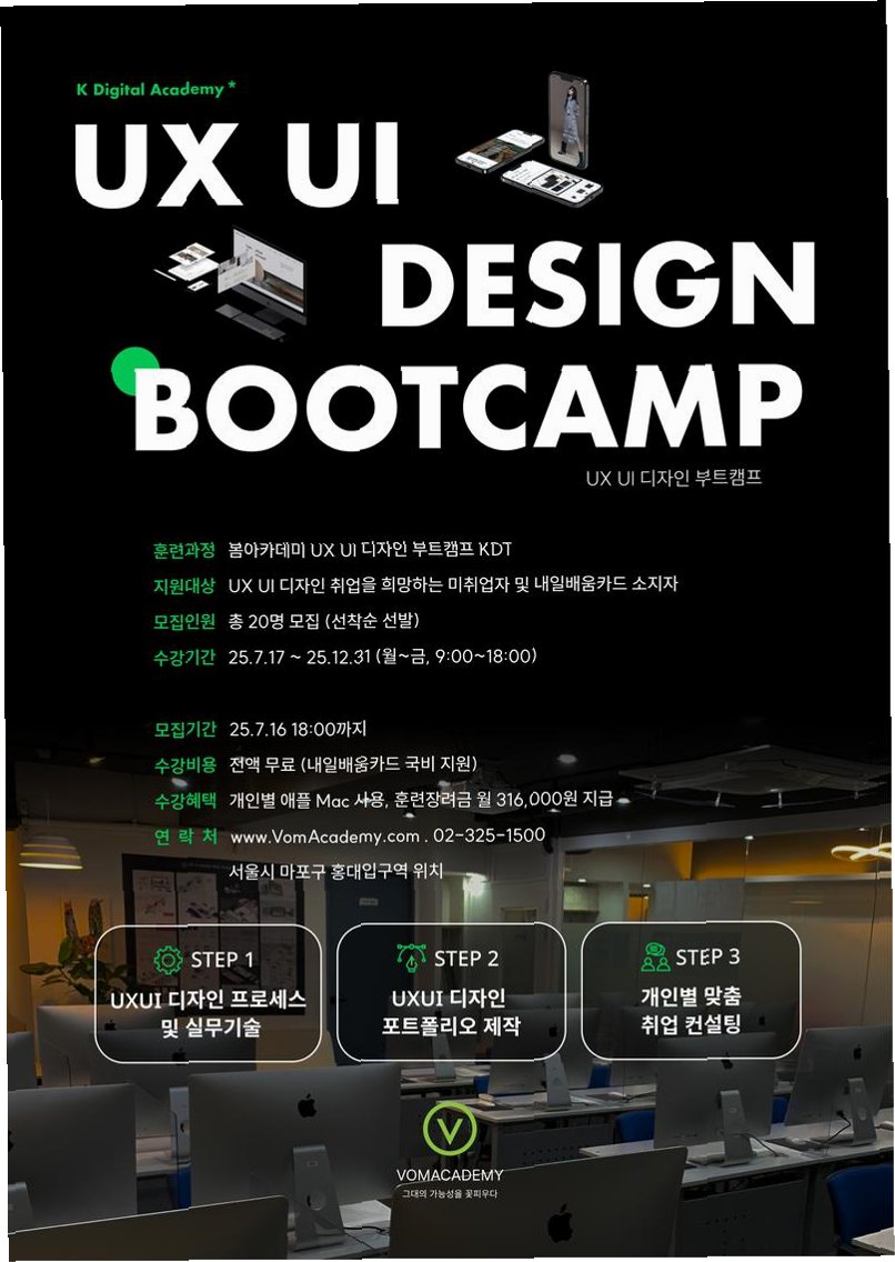 KDT 부트캠프, 무엇을 배우는 곳일까요?KDT 부트캠프는 '국민 내일 배움 카드'를 활용하여, 고용노동부의 지원을 받아 운영되는 직업 능력 개발 훈련 과정입니다. IT, 디자인, 데이터 분석 등 다양한 분야의 실무 교육을 제공하며, 취업을 목표로 하는 훈련생들에게 필요한 지식과 기술을 단기간에 습득할 수 있도록 돕습니다. 이론 교육뿐만 아니라, 프로젝트 기반의 실습을 통해 실제 업무 환경에서 필요한 역량을 키울 수 있다는 점이 가장 큰 특징입니다. 수료 후에는 취업 연계 프로그램, 멘토링, 컨설팅 등 다양한 지원을 받을 수 있어, 취업 성공률을 높이는 데 기여합니다. KDT 부트캠프는 단순히 기술을 배우는 곳을 넘어, 개인의 성장과 성공적인 커리어 설계를 위한 디딤돌 역할을 합니다. KDT 부트캠..