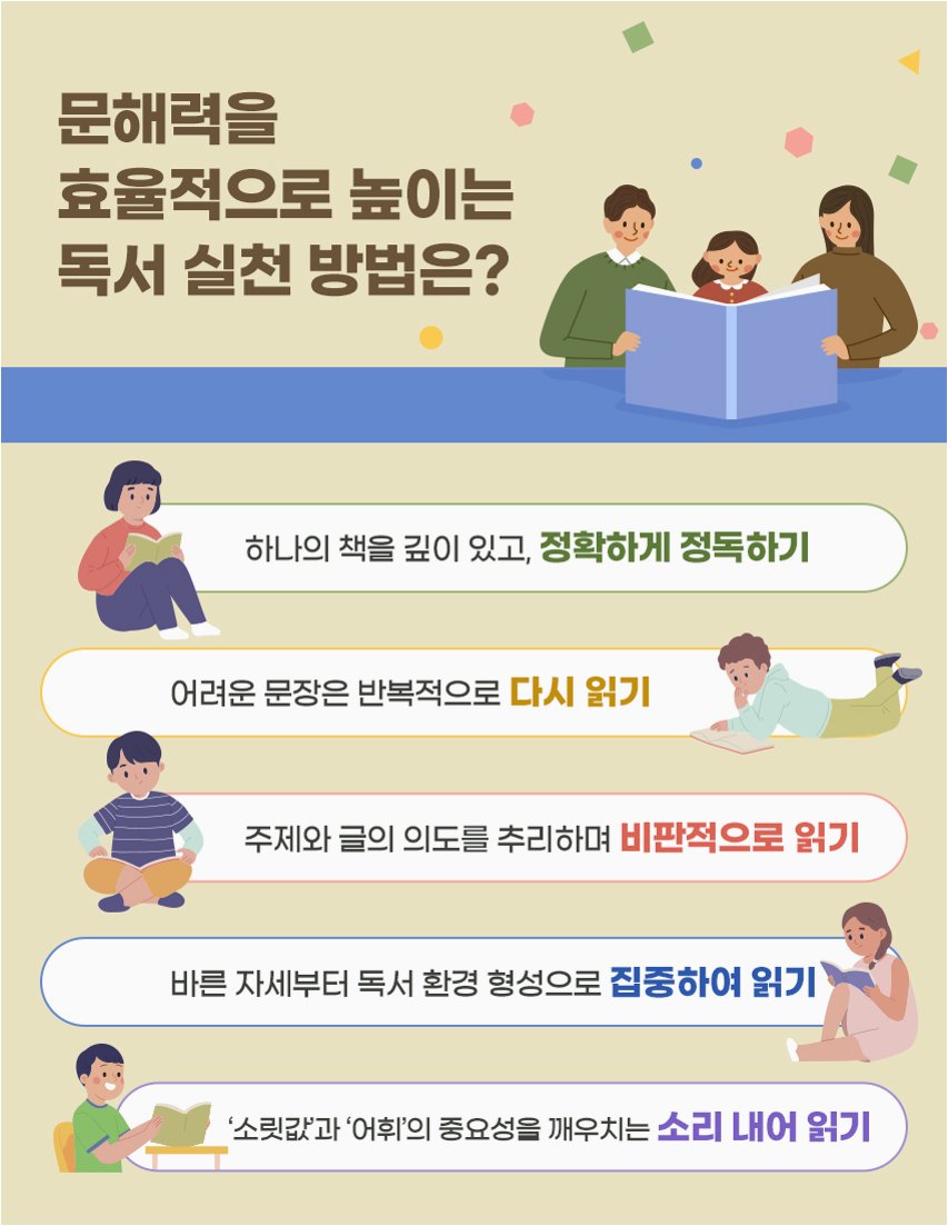 문해력, 왜 중요할까요?정보의 홍수 속에서 살아가는 현대인에게 문해력은 단순한 읽기 능력을 넘어섭니다. 글의 의미를 정확히 파악하고, 숨겨진 의도를 간파하며, 비판적으로 사고하는 능력은 학습, 업무, 그리고 일상생활 전반에 걸쳐 성공의 기반이 됩니다. 문해력이 부족하면 복잡한 지시를 이해하지 못하거나, 잘못된 정보에 현혹되기 쉬워 삶의 질 저하로 이어질 수 있습니다. 따라서 꾸준한 문해력 향상은 개인의 성장과 더 나은 삶을 위한 필수적인 투자입니다. 실제 연구들은 높은 문해력 수준을 가진 사람들이 더 나은 직업적 기회를 얻고, 사회적으로도 더 큰 만족감을 느낀다고 보고하고 있습니다. 나만의 속도로 문해력 높이기문해력 향상은 단거리 경주가 아닌 마라톤과 같습니다. 조급해하지 않고 꾸준히 실천하는 것이..